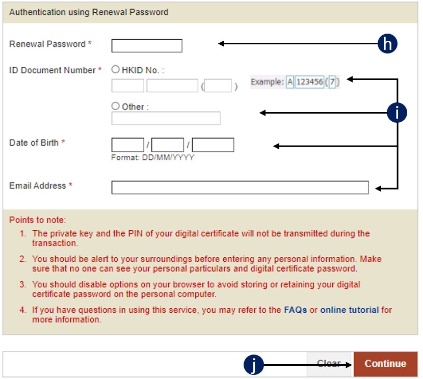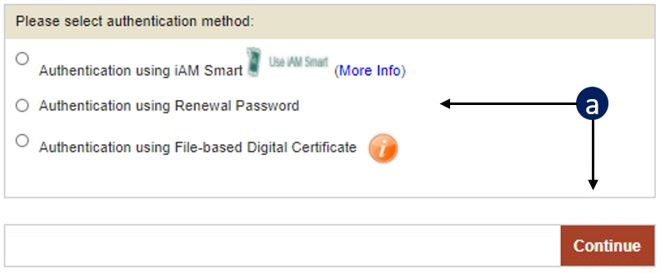 (See b to g if you choose iAM Smart. See h to j if you select the Renewal Password. See k to n if you select the File-based Digital Certificate.)