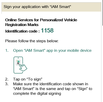 2. Open “iAM Smart” app in your mobile device. 3. Tap on “To sign”. 4. Make sure the “Identification code” shown in “iAM Smart” is the same as shown in web page and tap on “Sign” to complete the digital signing. |